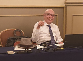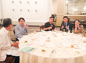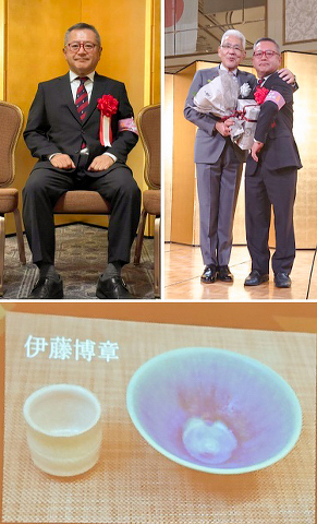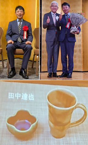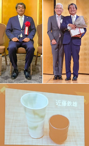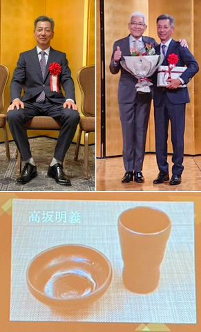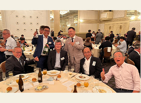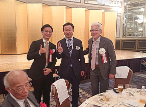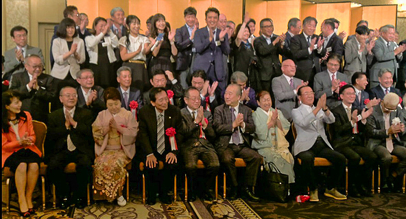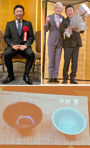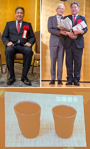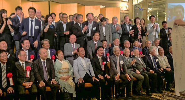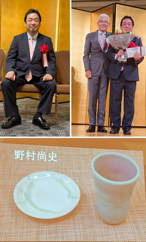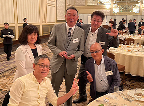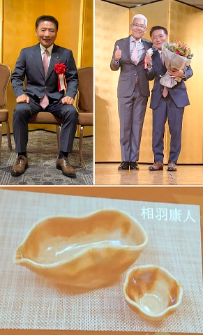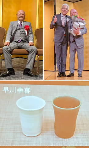 続いて、前田総務副会長のご挨拶と乾杯で、祝賀会が和やかにスタートし、メインイベントでは喜寿、古希、還暦の順にお言葉を頂戴いました。喜寿、古希でパートナー同伴の会員はご一緒に登壇していただき喜びを分かち合いました。還暦会員は自己紹介と同期会(7月陶芸体験)で作成した作品の自慢をしていただきました。メインイベントの最後に還暦会員全員で歌っていただいた「青春時代」で会場は大いに盛り上がりました。