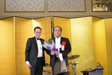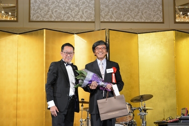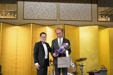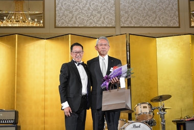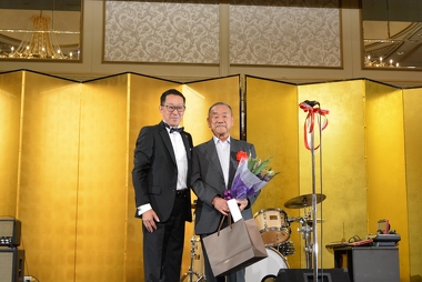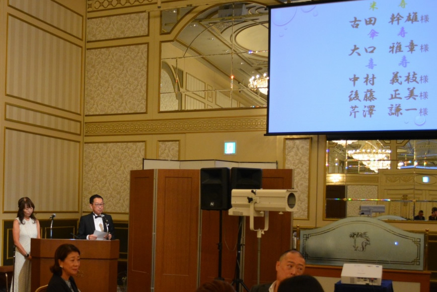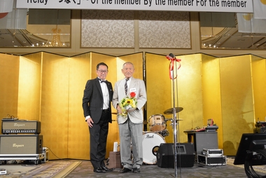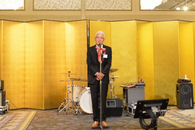 続いて、山本完監事のご挨拶と乾杯で、祝賀会が和やかにスタートし、メインイベントでは米寿、傘寿、喜寿、古希、還暦の順に選んでいただいた写真をスクリーンに映し出し、稲熊交流委員長がインタビュー形式でお言葉を頂戴いました。