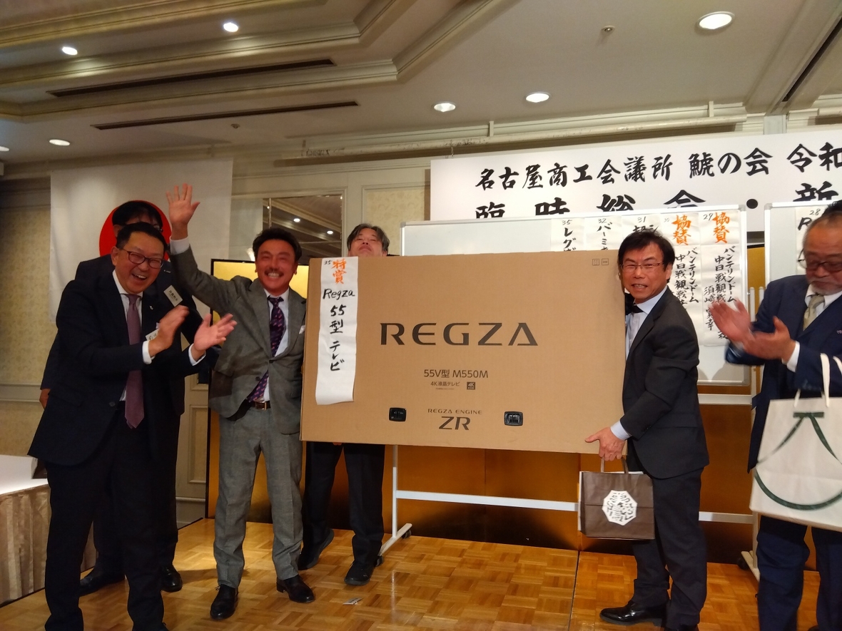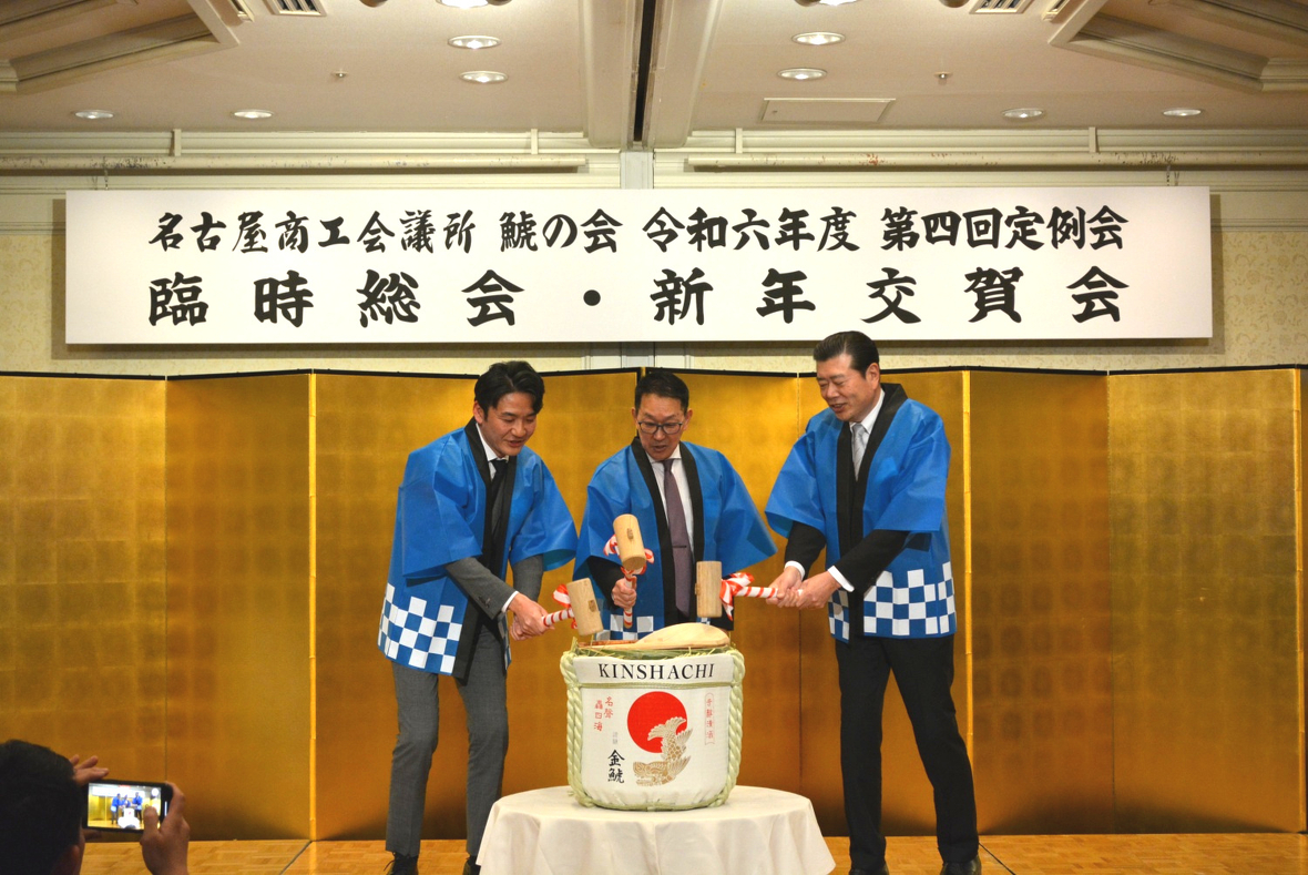 第2部の新年交賀会は名古屋商工会議所若鯱会の山田代表幹事の祝辞で始まり前田会長・山田代表幹事・西村副会長による鏡開きのあと、竹内広報副会長の乾杯で祝宴がスタートしました。